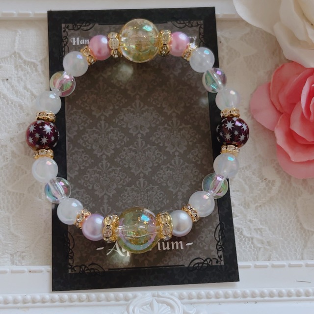 この度はたくさんあるハンドメイド作品の中より、当方の作品をお目に留めて頂きありがとうございます。 見た目は白のオーロラですが 太陽光に当てると色がつき輝く不思議なビーズを使用。 太陽光で見せてくれる色は黄色と紫の2種のため、 メインビーズにも上記の2色を使用。 ※SNSに出してsold out 再販予定あり。 ☆ ブレスレットのビーズは主に8ミリサイズのビーズで作っており、メインの飾りとなるビーズは10〜14mmほどの大きめのビーズを使用しております。 。*⑅୨୧┈┈┈┈┈┈┈┈┈୨୧⑅*。 シリコン製ゴムテグスで制作しております。 内周約16cmで制作。 (デザインにより多少の前後あり) ※強い力で引っ張ると壊れてしまうことがあるため、お取扱にご注意ください。