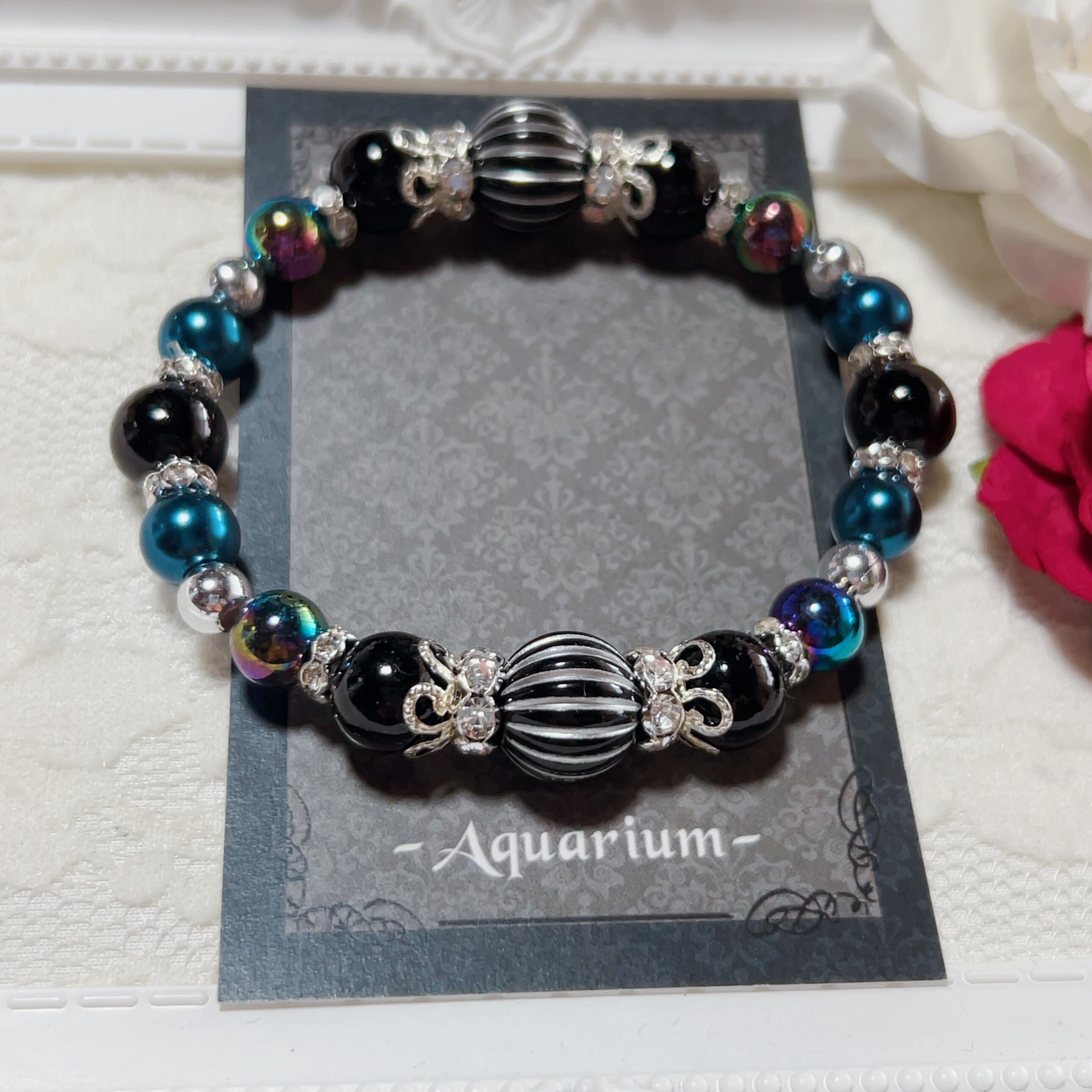 ブレスレットのビーズは主に8ミリサイズのビーズで作っており、メインの飾りとなるビーズは10〜14mmほどの大きめのビーズを使用しております。