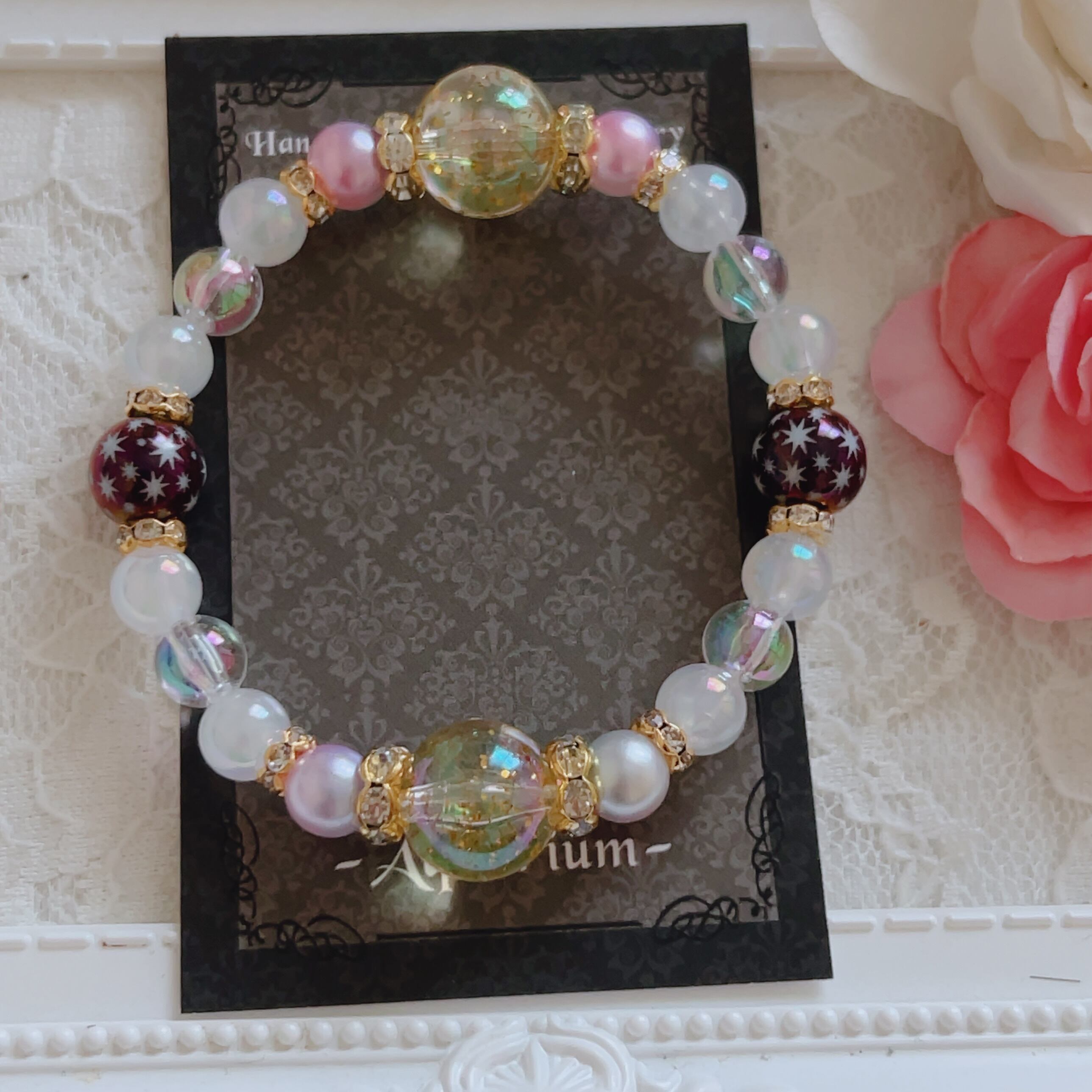 ブレスレットのビーズは主に8ミリサイズのビーズで作っており、メインの飾りとなるビーズは10〜14mmほどの大きめのビーズを使用しております。