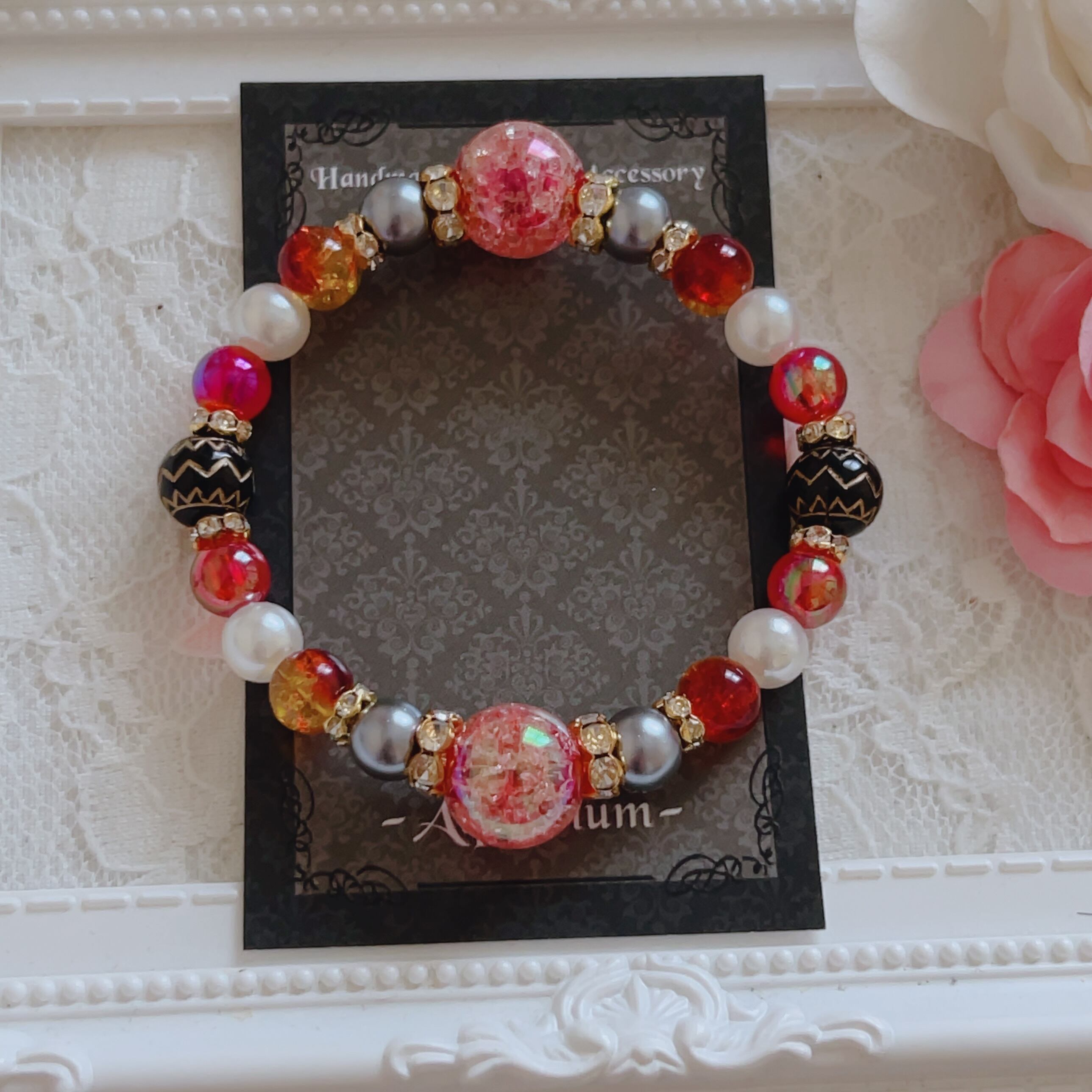 ブレスレットのビーズは主に8ミリサイズのビーズで作っており、メインの飾りとなるビーズは10〜14mmほどの大きめのビーズを使用しております。