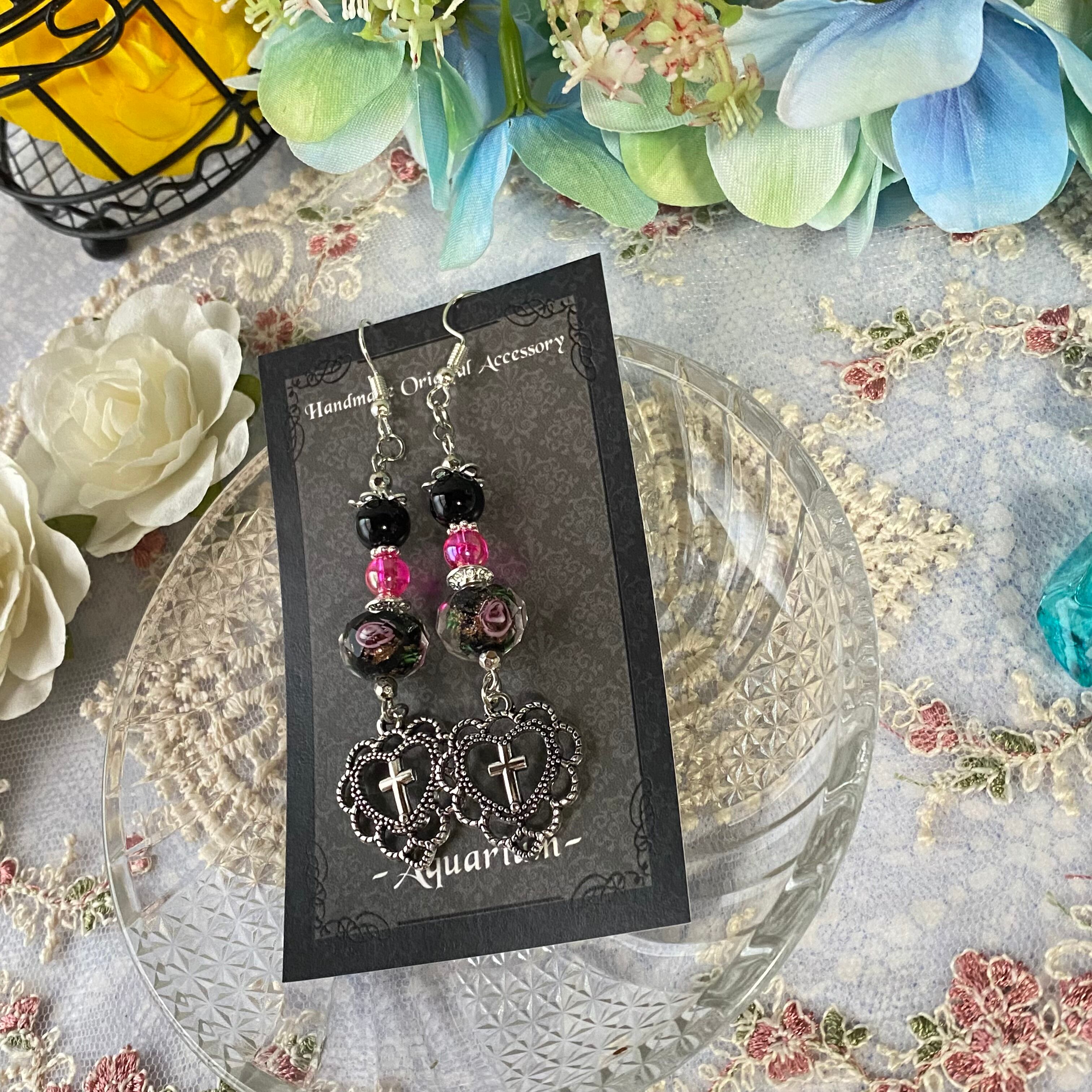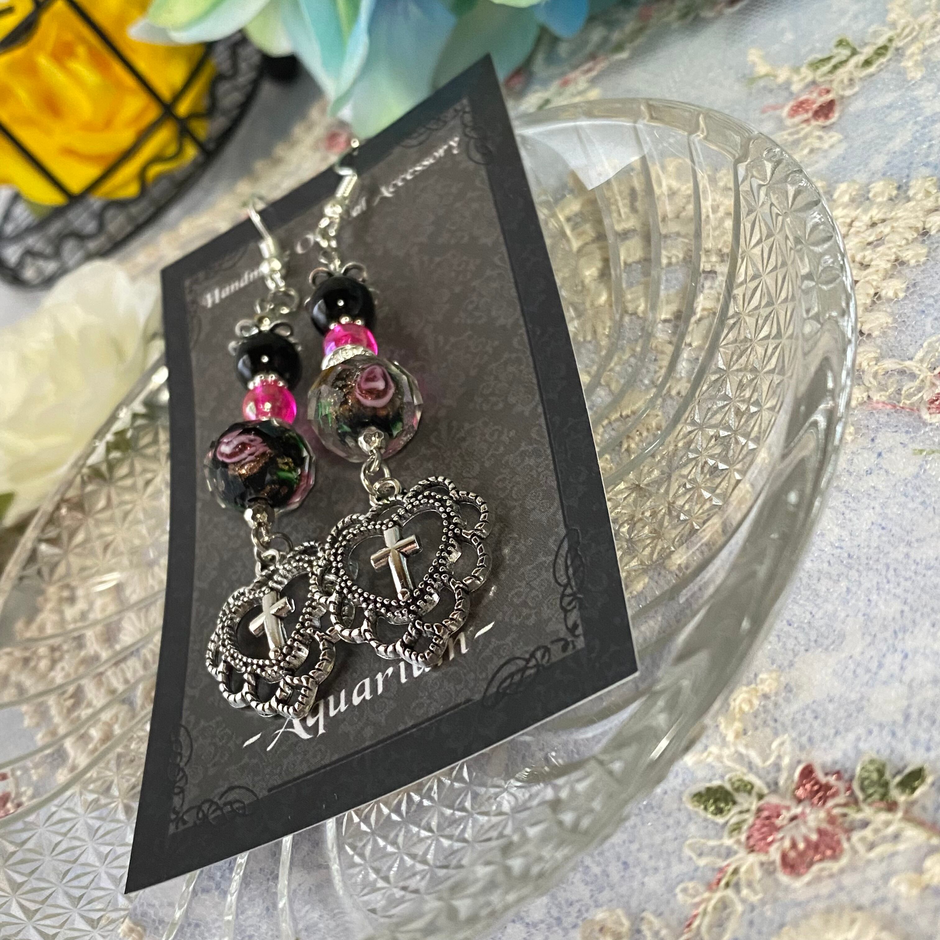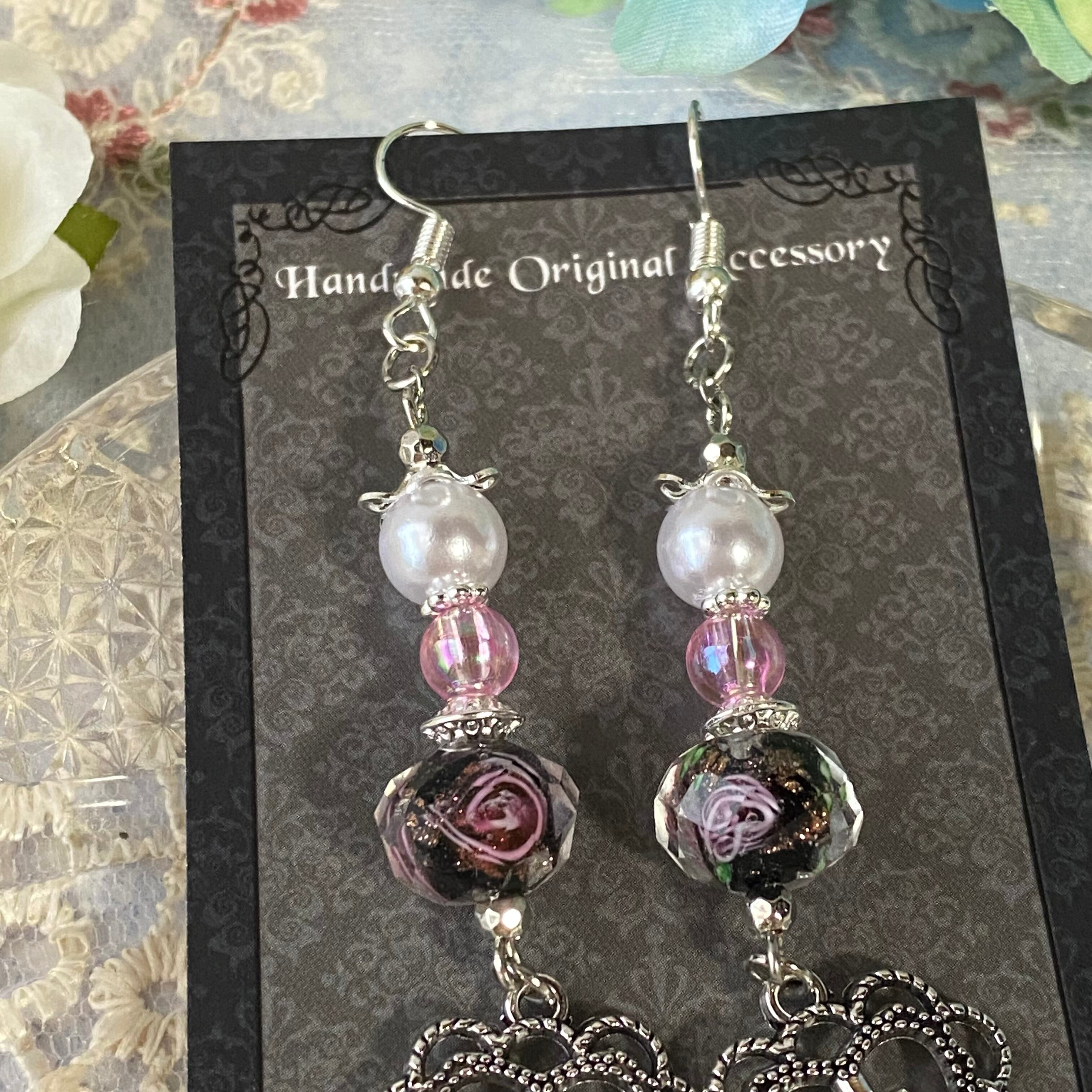 ビーズの中で描かれているピンクの薔薇がとても美しいので、薔薇好きにはたまらないピアスだと思います!