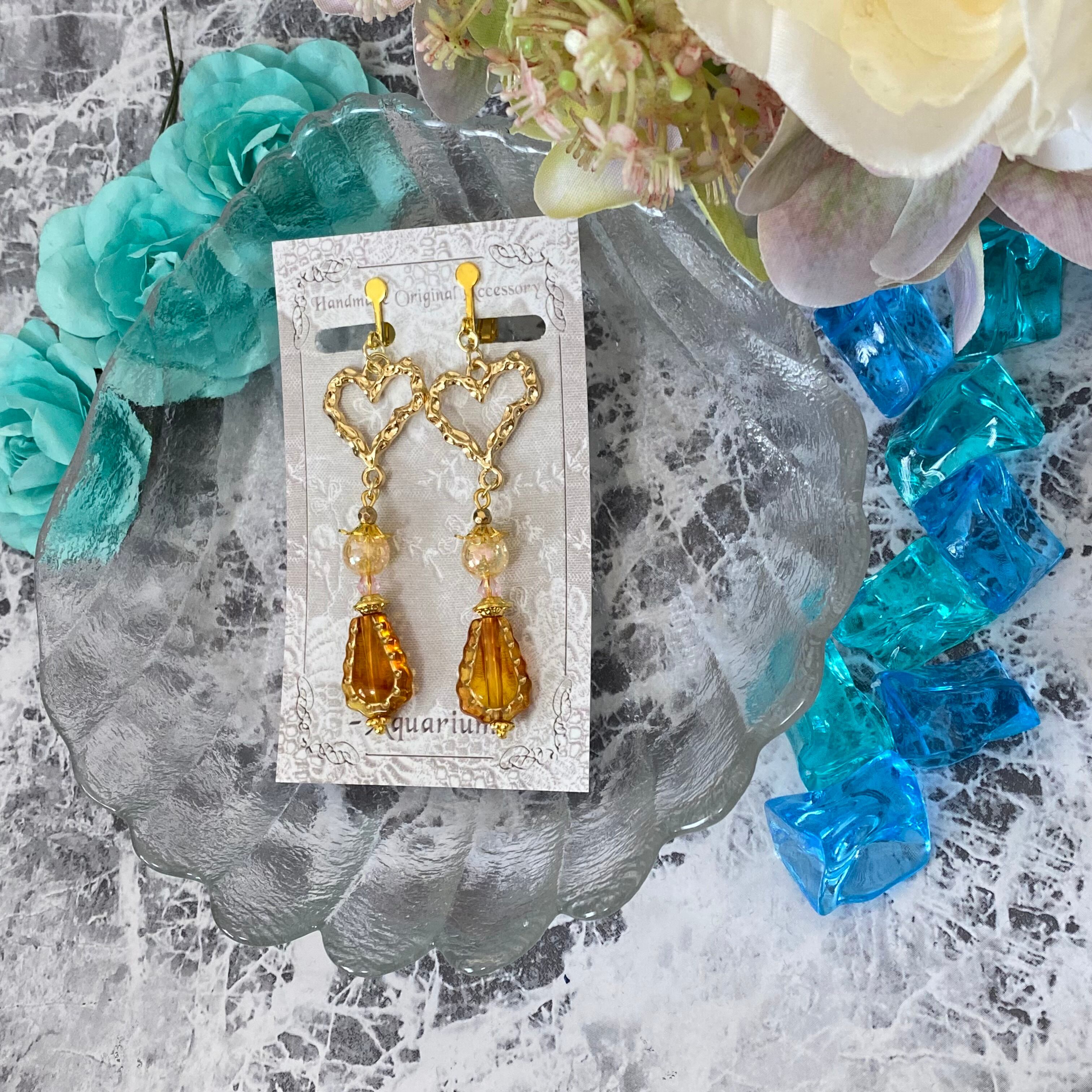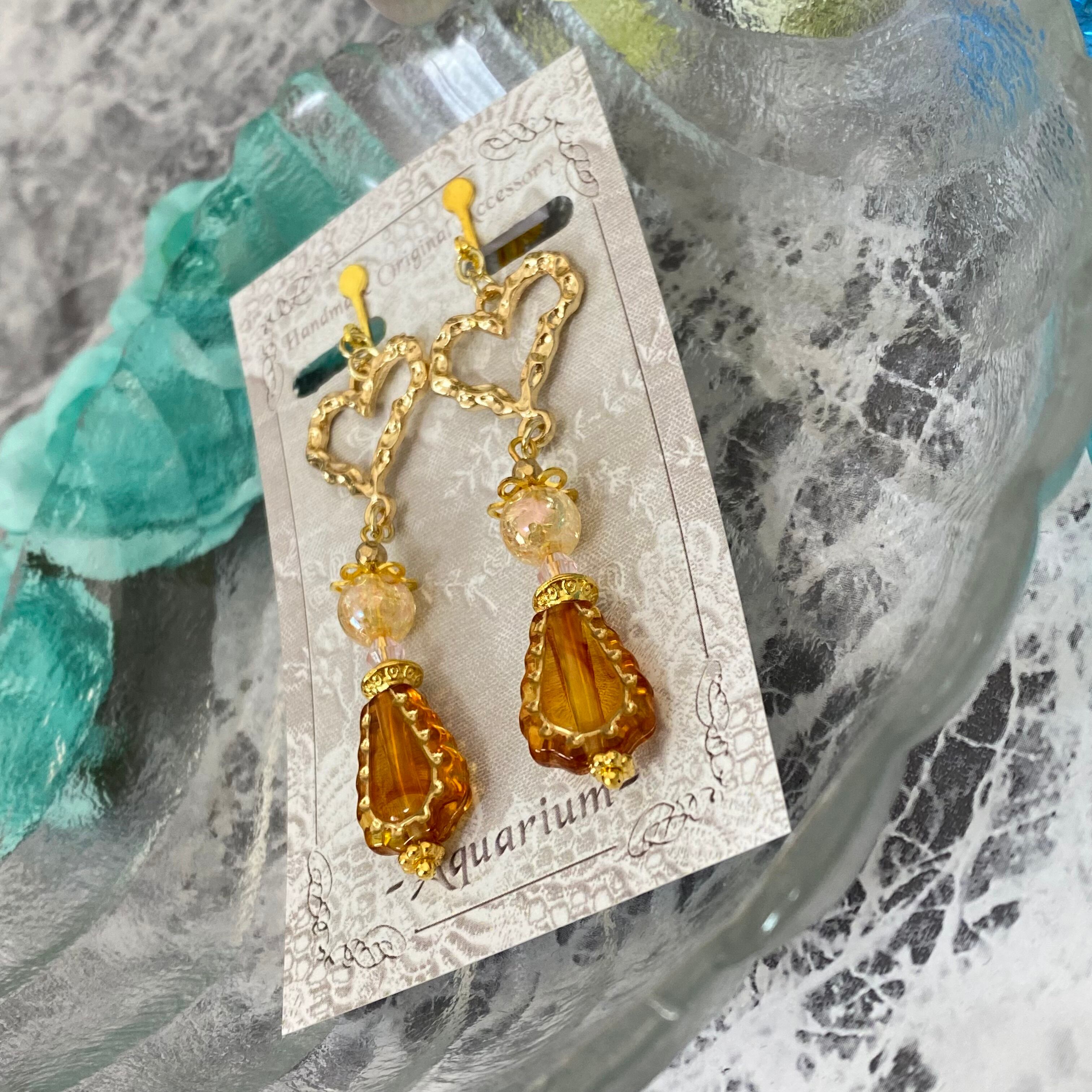 【E09】アンティークオレンジとハートが煌めくイヤリング