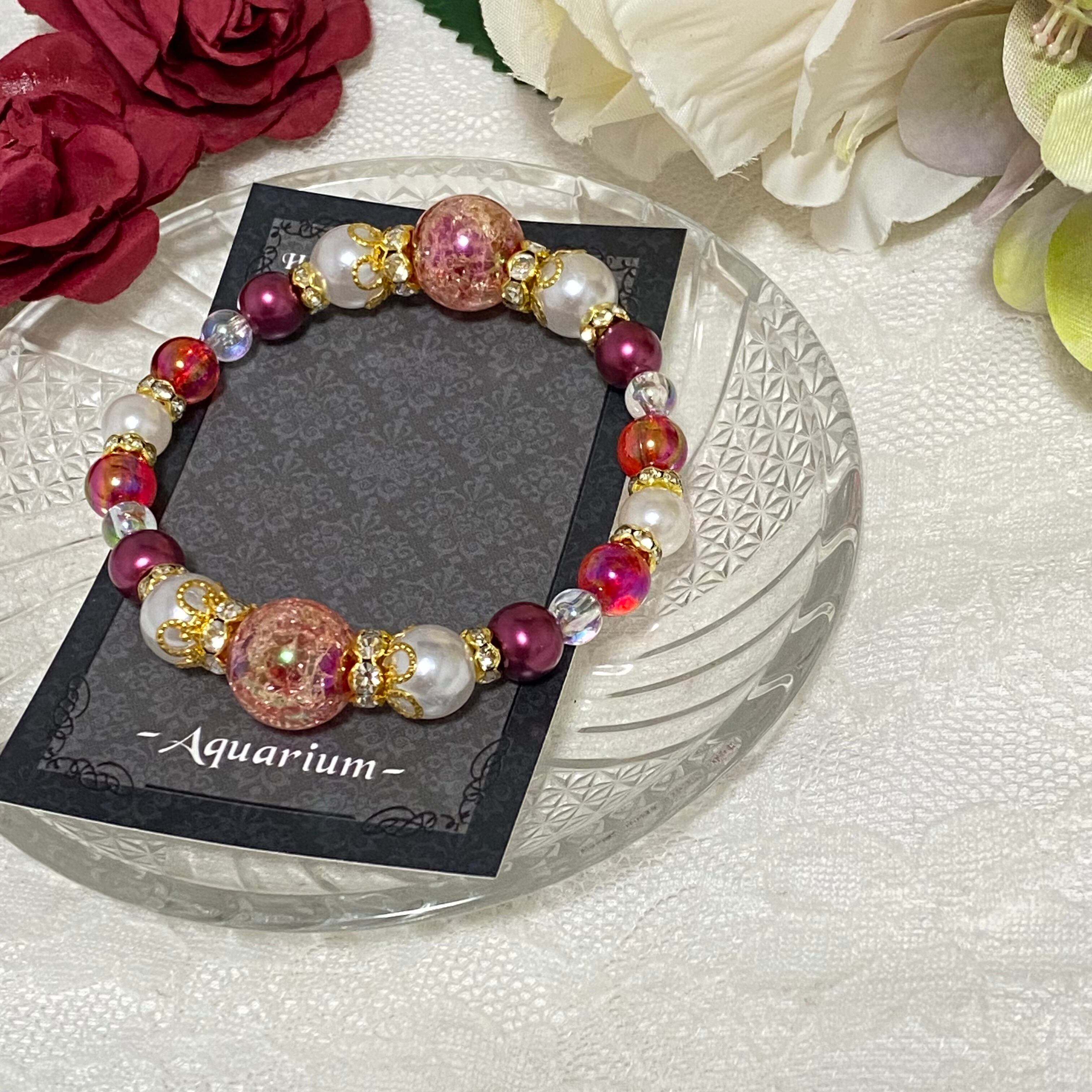ブレスレットのビーズは主に8ミリサイズのビーズで作っており、メインの飾りとなるビーズは10〜14mmほどの大きめのビーズを使用しております。