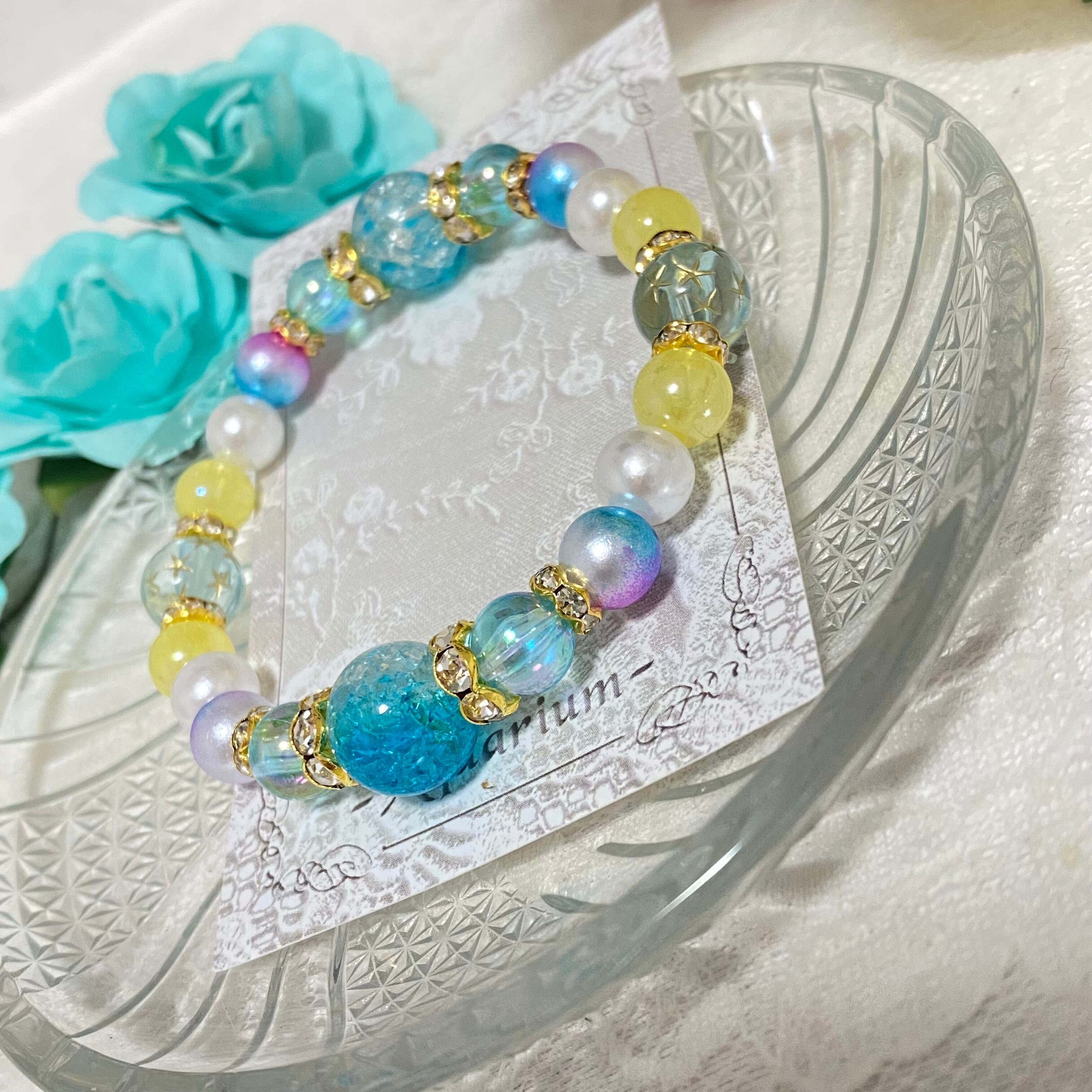 ブレスレットのビーズは主に8ミリサイズのビーズで作っており、メインの飾りとなるビーズは10〜14mmほどの大きめのビーズを使用しております。