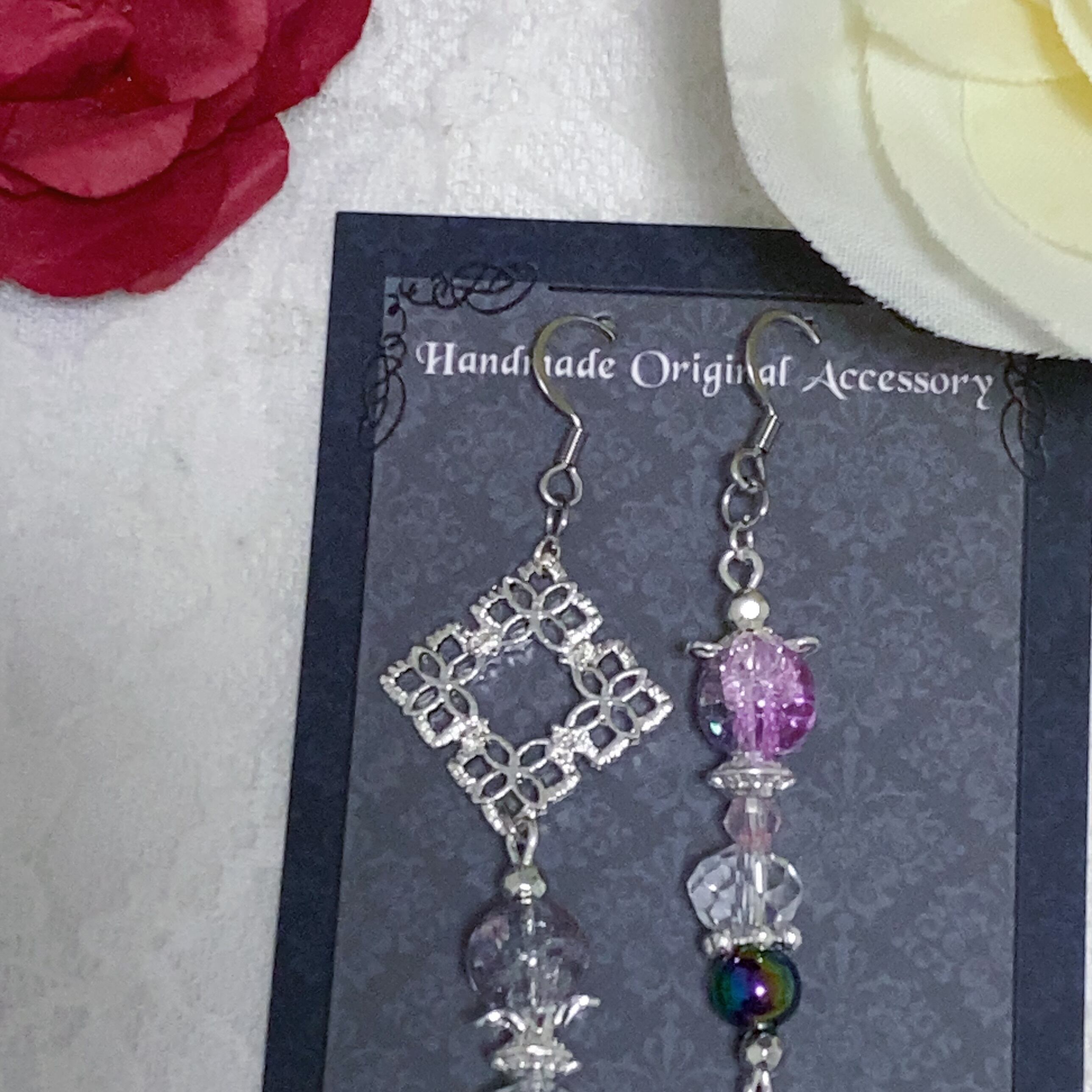 斑がかっこいいチャームとクラックビーズを使ってデザインした、かっこいいアシンメトリーデザインピアスです。