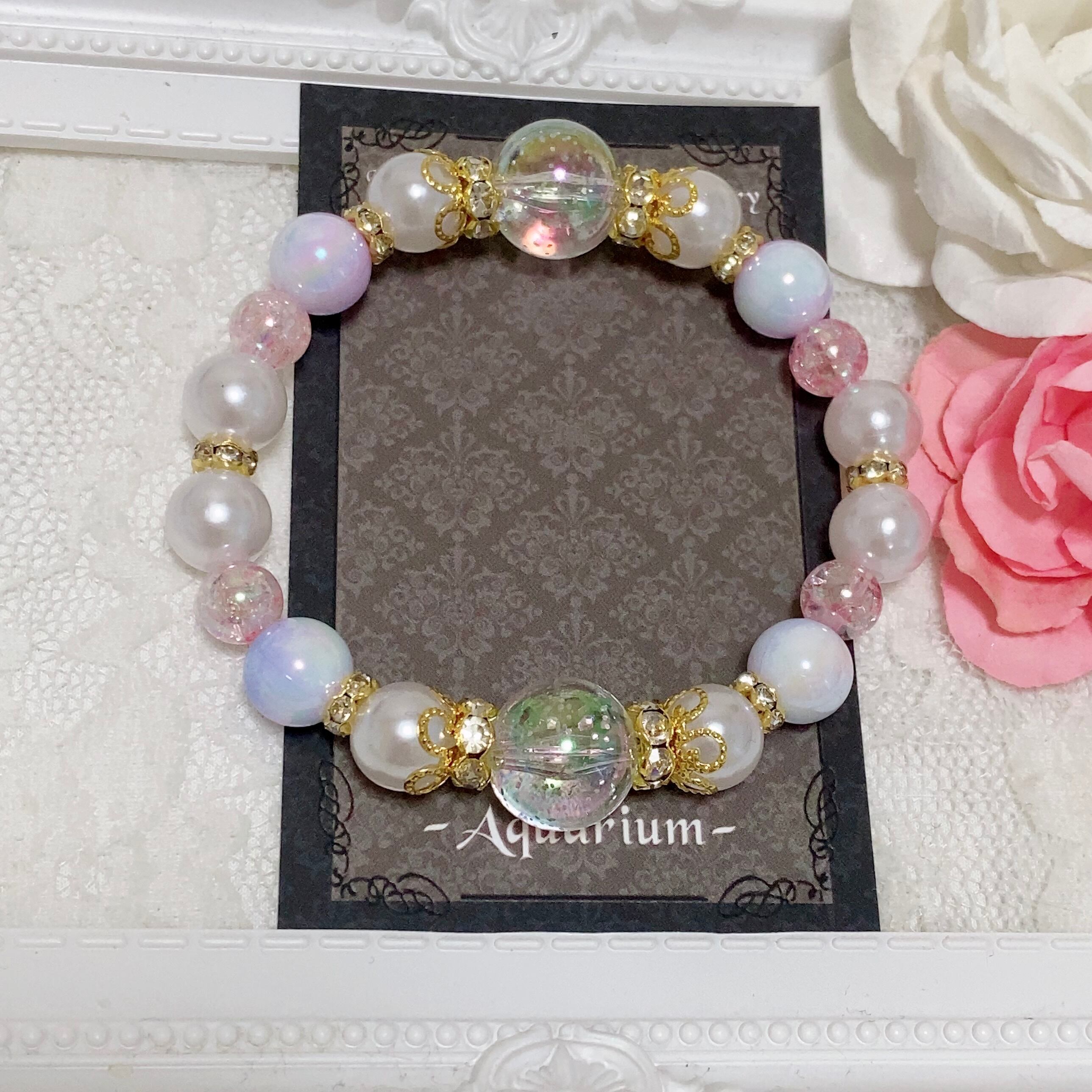 こちらのブレスレット作品ののビーズは主に10ミリサイズのビーズで作っております。