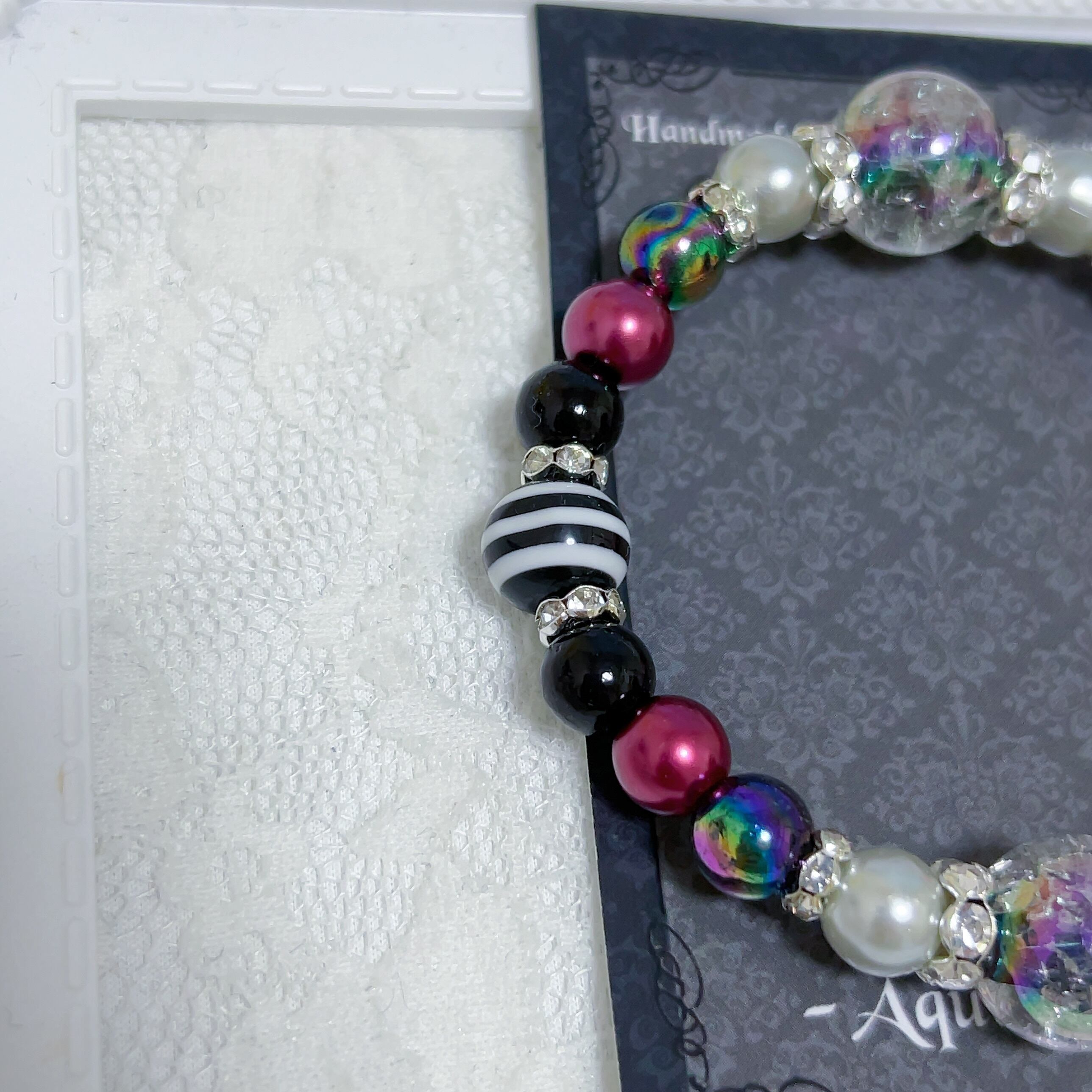 ブレスレットのビーズは主に8ミリサイズのビーズで作っており、メインの飾りとなるビーズは10〜14mmほどの大きめのビーズを使用しております。