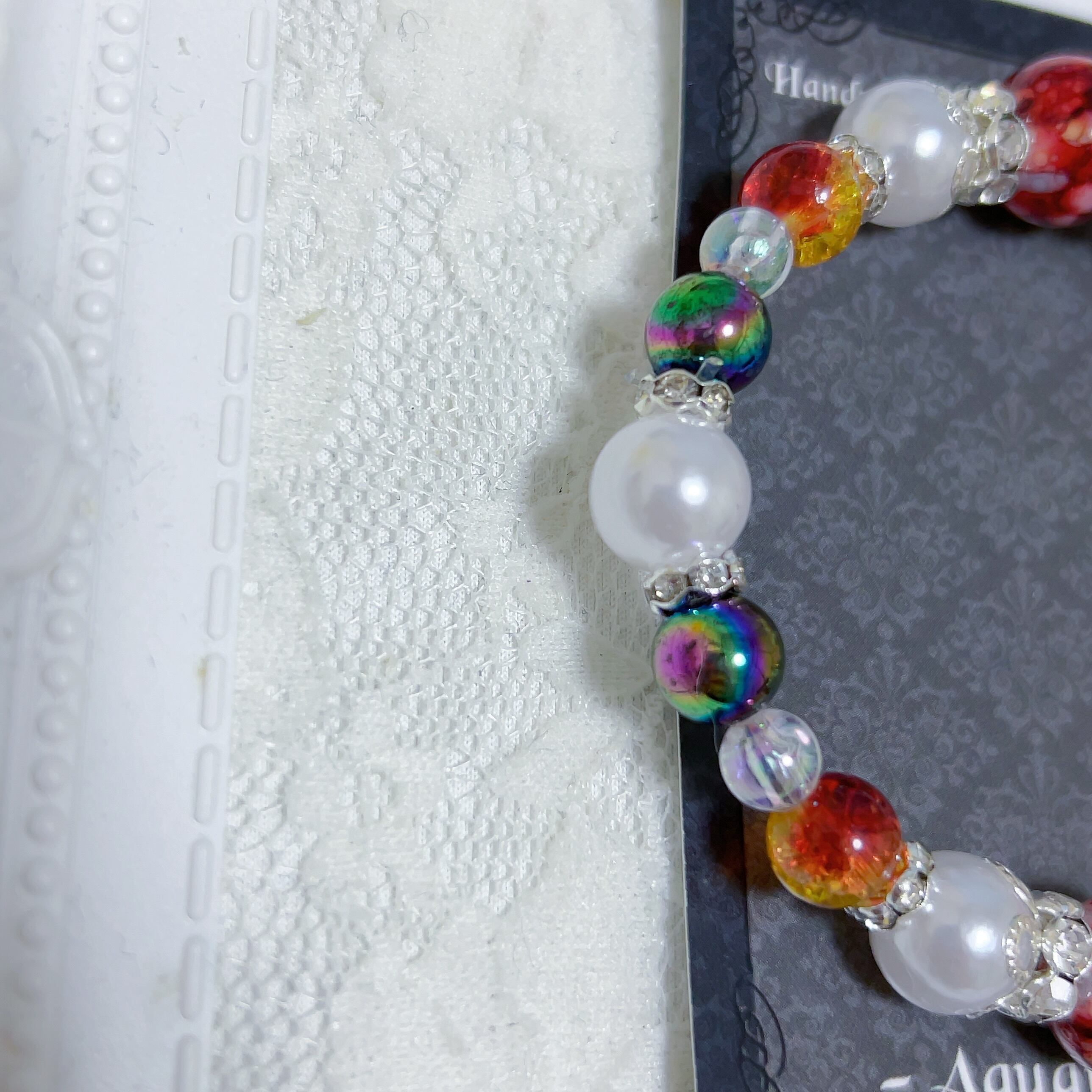 ブレスレットのビーズは主に8ミリサイズのビーズで作っており、メインの飾りとなるビーズは10〜14mmほどの大きめのビーズを使用しております。