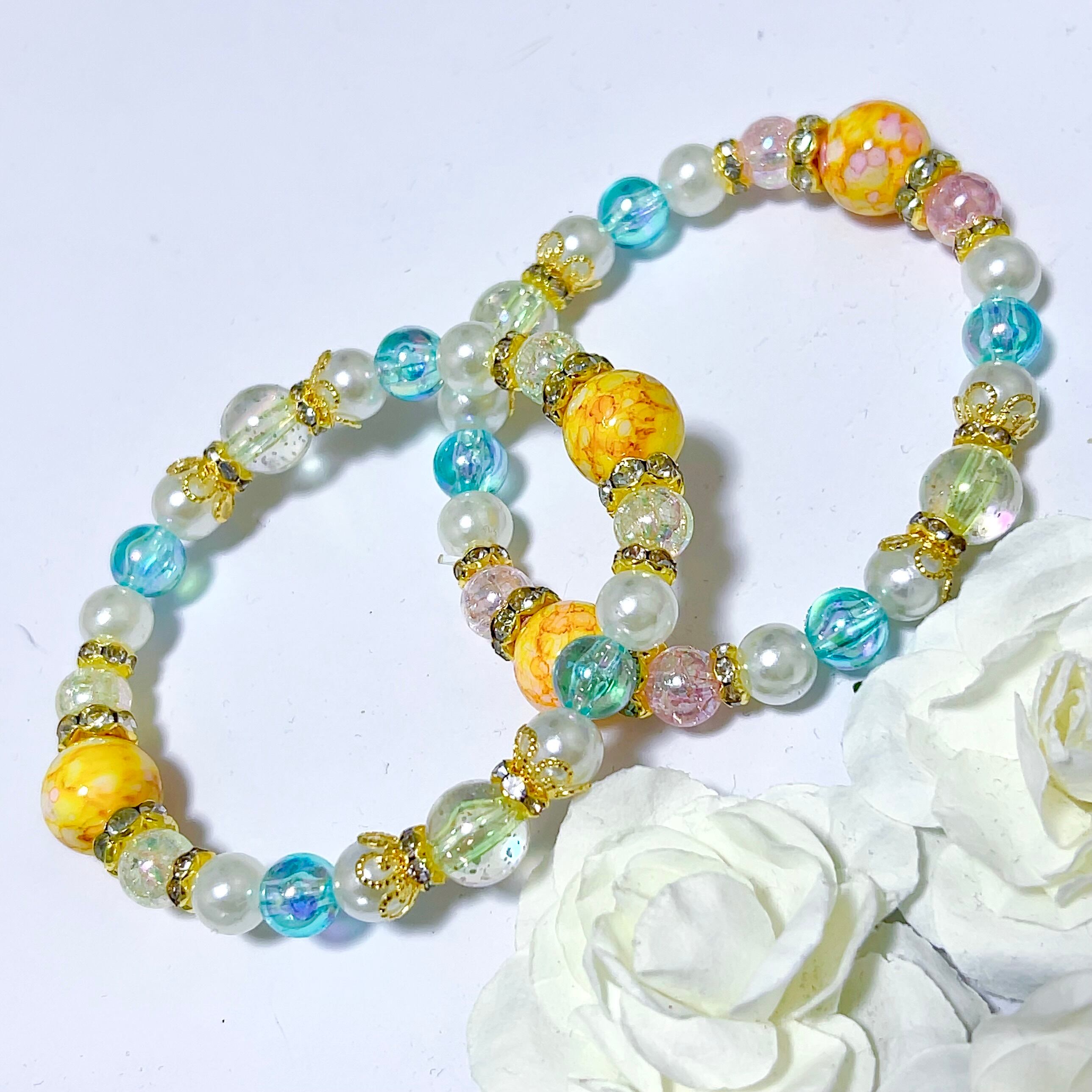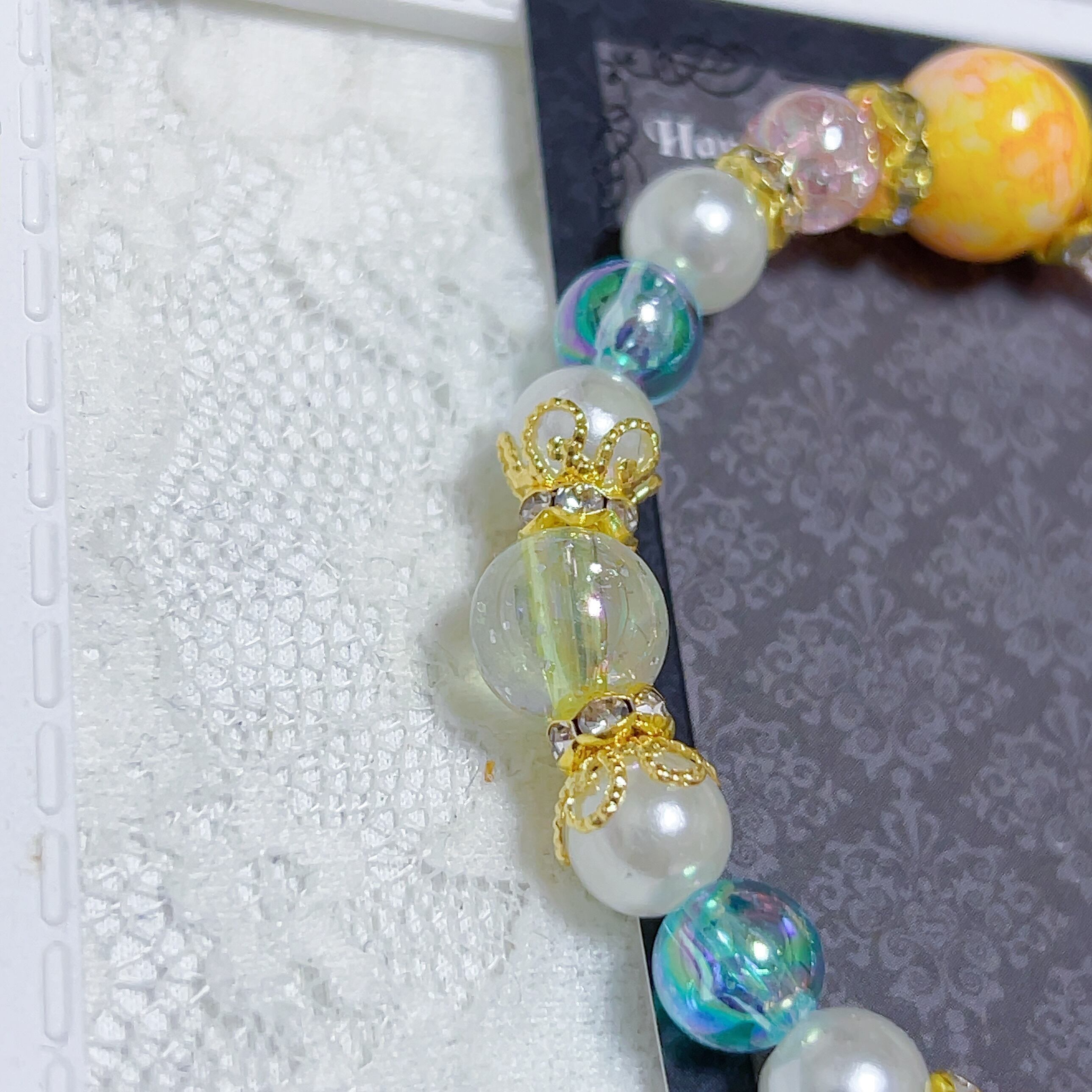 ブレスレットのビーズは主に8ミリサイズのビーズで作っており、メインの飾りとなるビーズは10〜14mmほどの大きめのビーズを使用しております。