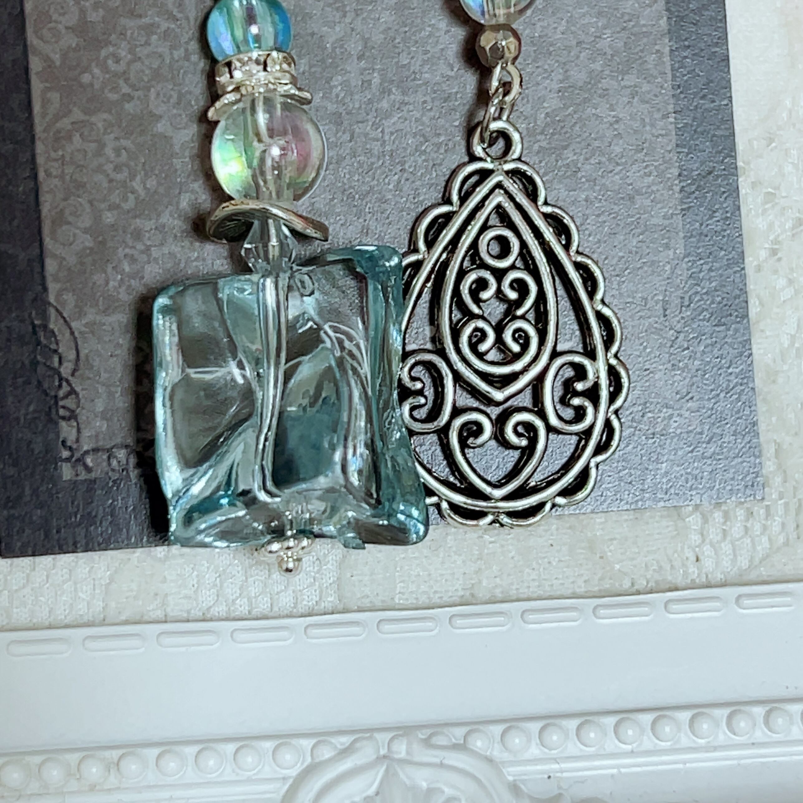 クリア系水色ビーズとアンティーク風チャームを使用した、大人系アシンメトリーピアス(イヤリング)